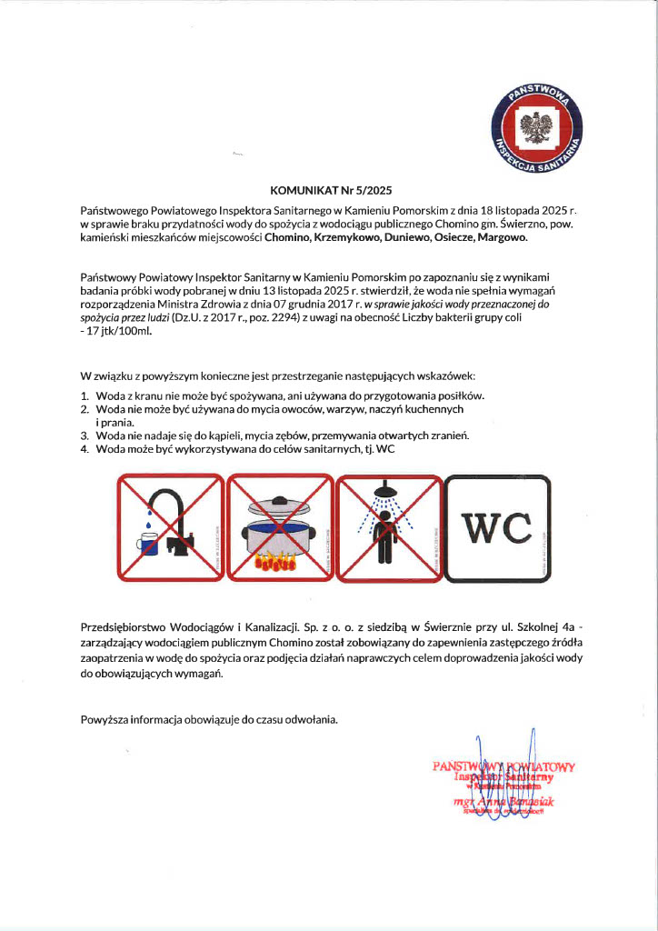 Państwowy Powiatowy Inspektor Sanitarny w Kamieniu Pomorskim wydał 18 listopada 2025 r. oficjalny komunikat dotyczący braku przydatności do spożycia wody z wodociągu publicznego Chomino w gminie Świerzno. Ostrzeżenie dotyczy mieszkańców miejscowości Chomino, Krzemykowo, Duniewo, Osiecze i Margowo.