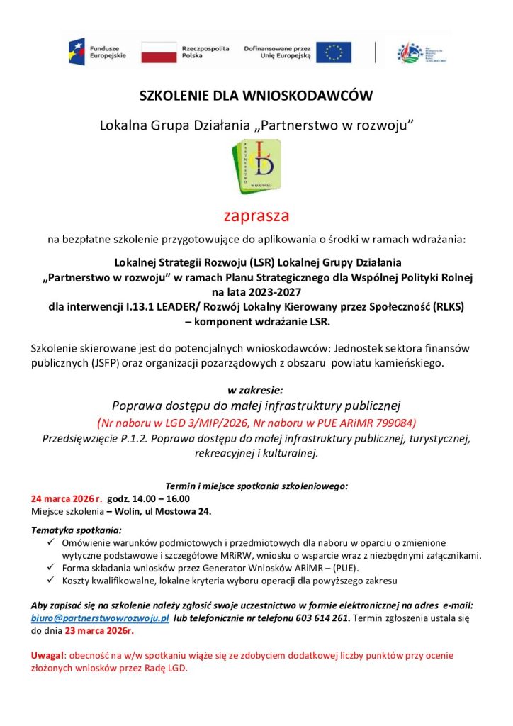 Zgłoszenia przyjmowane są do 23 marca 2026 roku drogą mailową lub telefonicznie. Udział w szkoleniu przełoży się na uzyskanie dodatkowych punktów przy ocenie składanych wniosków.