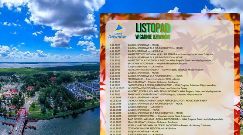 Gmina Dziwnów przygotowała bogaty harmonogram wydarzeń na listopad. Wśród licznych zajęć sportowych, warsztatów, koncertów i spotkań kulturalnych szczególne miejsce zajmują uroczystości związane z Narodowym Świętem Niepodległości — sprawdź harmonogram!