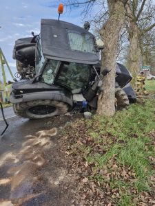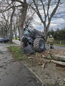 W środę, 10 grudnia 2025 roku o godzinie 13:14 służby zostały zadysponowane do zdarzenia drogowego w miejscowości Darzowice (gm. Wolin). Doszło tam do kolizji ciągnika rolniczego, który uderzył w drzewo przy przejściu dla pieszych. Siła zderzenia była na tyle duża, że pojazd został poważnie uszkodzony.
