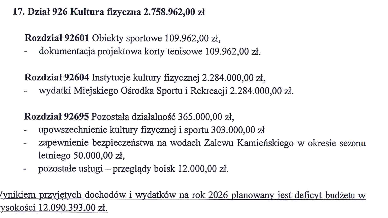 W budżecie na 2026 rok, w dziale kultura fizyczna, znajdujemy zapis: dokumentacja projektowa korty tenisowe – 109 962,00 zł