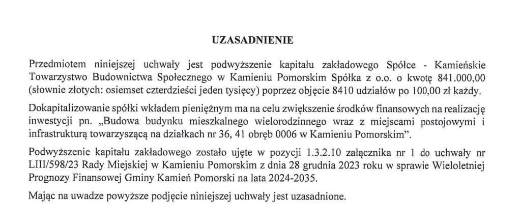 Za to rok temu, 17 grudnia, na sesję przyszła prezes Kamieńskiego Towarzystwa Budownictwa Społecznego — Joanna Kronenberg. Przyszła w konkretnym celu — prosić radnych o 841 tys. zł dokapitalizowania poprzez objęcie 8410 udziałów po 100,00 zł każdy. Środki te miały być niezbędne do sfinalizowania inwestycji — budowy budynku mieszkalnego.