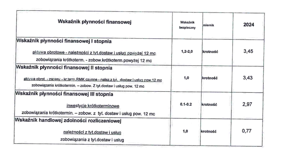 Dodatkowo, w sprawozdaniu spółka wskazuje na bardzo wysoką nadpłynność finansową. Wszystkie trzy wskaźniki płynności znacząco przewyższają wartości uznawane za bezpieczne.