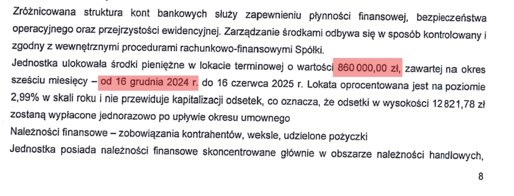 Analizując sprawozdanie z działalności spółki za 2024 rok, napotykamy się na interesującą informację, że spółka ulokowała 16 grudnia środki o wartości 860 000,00 zł na lokacie półrocznej. Dosłownie dzień przed sesją, na której prezes Joanna Kronenberg prosiła o tak konieczne dokapitalizowanie na kwotę 841 000,00 zł, by zakończyć inwestycję.