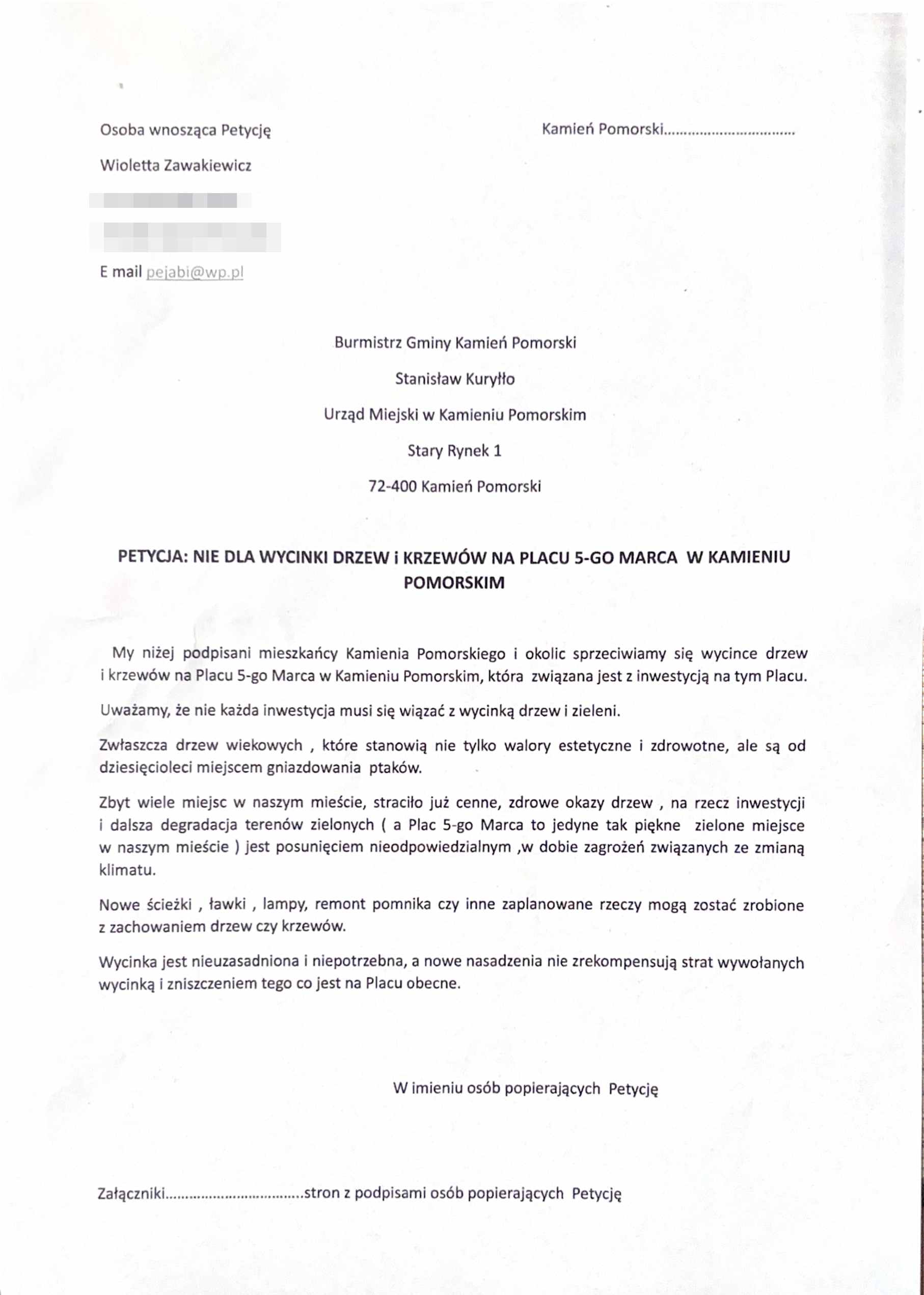 My niżej podpisani mieszkańcy Kamienia Pomorskiego i okolic sprzeciwiamy się wycince drzew i krzewów na Placu 5-go Marca w Kamieniu Pomorskim, która związana jest z inwestycją na tym Placu.