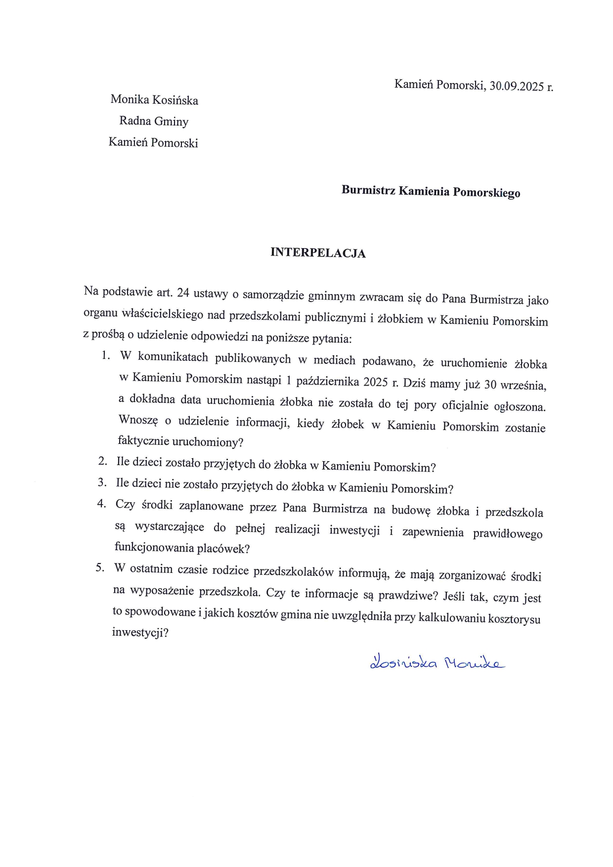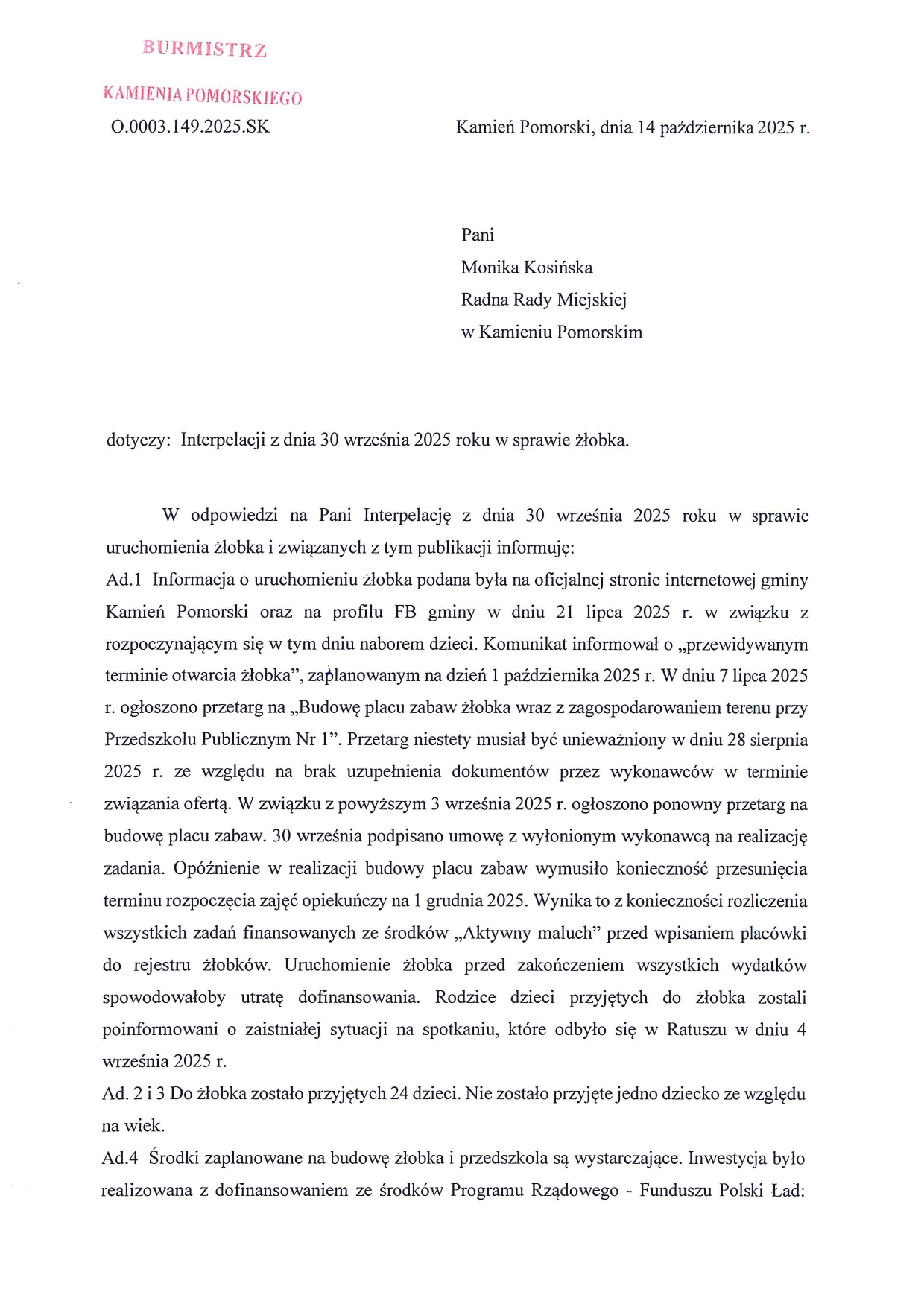 W odpowiedzi na interpelację radnej Kosińskiej burmistrz już nie pisze o prawie budowlanym, a o wymaganiach instytucji finansującej i konieczności rozliczenia wszystkich zadań finansowanych ze środków „Aktywny maluch”. Uruchomienie żłobka przed zakończeniem wszystkich wydatków spowodowałoby utratę dofinansowania.