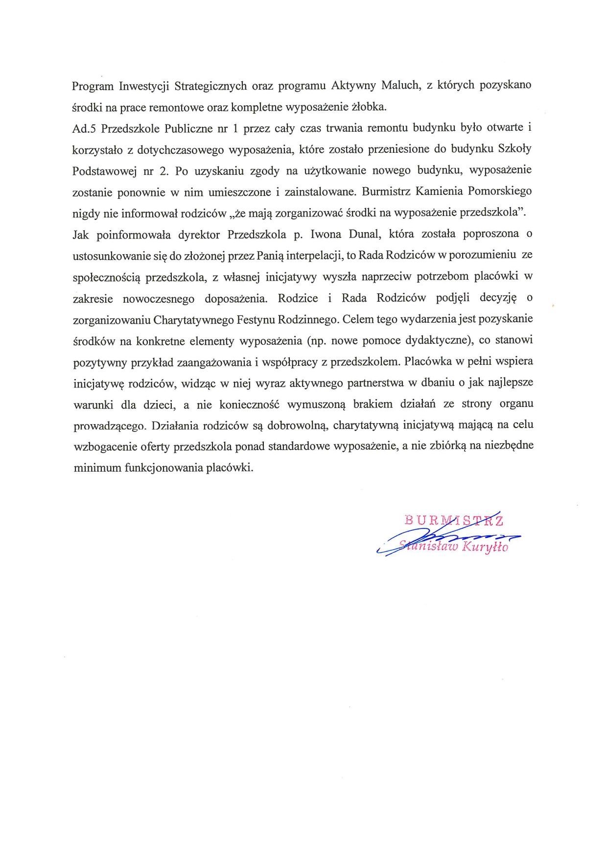 • Masz dziecko w przedszkolu? Cieszę się, za 2 miesiące będą inni mieli w żłobku. Ja tu nie widzę by to było o przedszkolu. O przedszkolu jest tyle co zawiera skan odpowiedzi podpisanej przez Burmistrza o świetnym wyposażeniu przedszkola, udzielonej w związku z interpelacją radnej. To jest pozytywne i jest radość z otwarcia.
