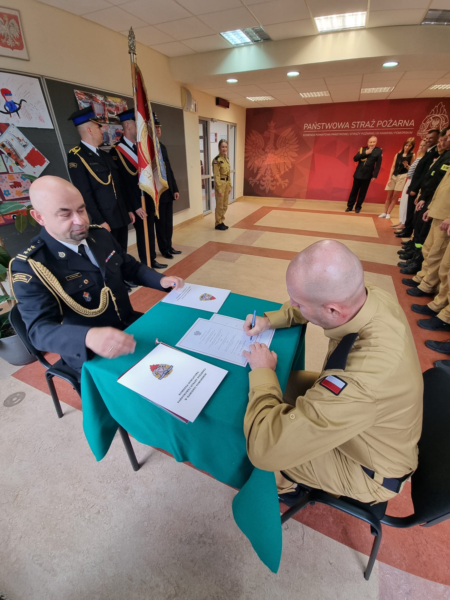 Ślubowanie w obecności Pocztu Sztandarowego Komendy Powiatowej Państwowej Straży Pożarnej w Kamieniu Pomorskim, Dowódcy JRG PSP, pracowników komendy oraz zmiany służbowej, przyjął Komendant Powiatowy PSP st. bryg. Roman Pikulski