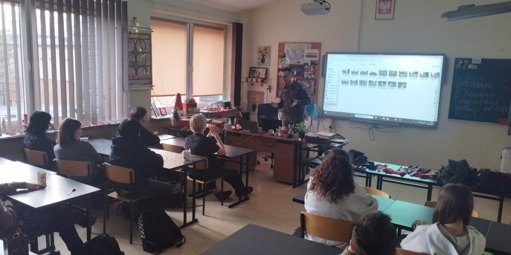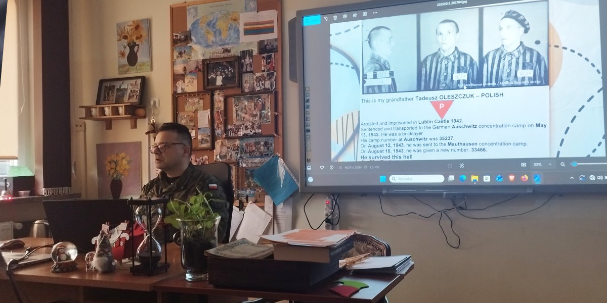 Wychodząc naprzeciw problemom związanym z niejednoznaczną interpretacją historii, nauczycielka historii Renata Włodarczyk podjęła decyzję o zaproszeniu do szkoły osoby, która z ogromnym zaangażowaniem dba o zachowanie prawdy o niemieckich obozach koncentracyjnych. Gościem był pan Grzegorz Oleszczuk, dla którego temat ten ma również wyjątkowo osobisty wymiar. Dziadek pana Grzegorza, pan Tadeusz Oleszczuk, był więźniem obozu koncentracyjnego w Oświęcimiu, a następnie w Mauthausen. Ten rodzinny ślad sprawia, że pan Oleszczuk z jeszcze większym oddaniem, w ramach Stowarzyszenia Polskich Ofiar Obozów Koncentracyjnych, angażuje się w upamiętnianie ofiar oraz w przekazywanie młodemu pokoleniu rzetelnej wiedzy dotyczącej tragicznych wydarzeń II wojny światowej.