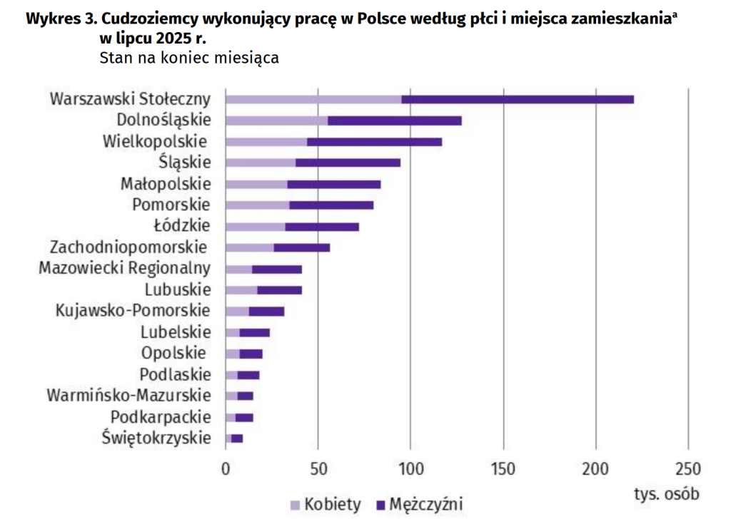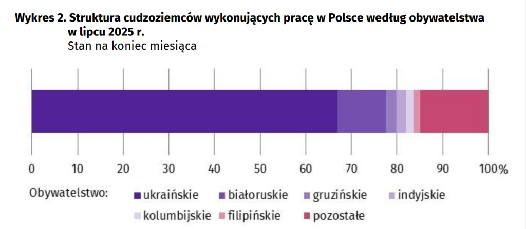 Niezmiennie najliczniejszą grupą pozostają obywatele Ukrainy, którzy w lipcu 2025 r. stanowili 67,0% wszystkich pracujących obcokrajowców w Polsce. W naszym województwie ich obecność jest szczególnie widoczna – pod koniec 2024 r. pracowało tu 4,7% wszystkich ubezpieczonych Ukraińców w kraju.