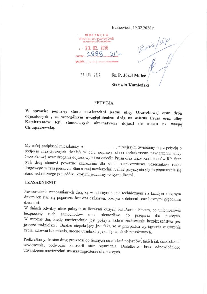 - Petycja nr 5 (Mieszkańcy Kamienia Pomorskiego): Petycja o identycznej treści jak poprzednie, kładąca nacisk na fatalny stan techniczny dróg, który pogarsza się z każdym dniem.
