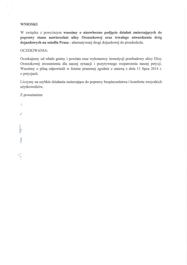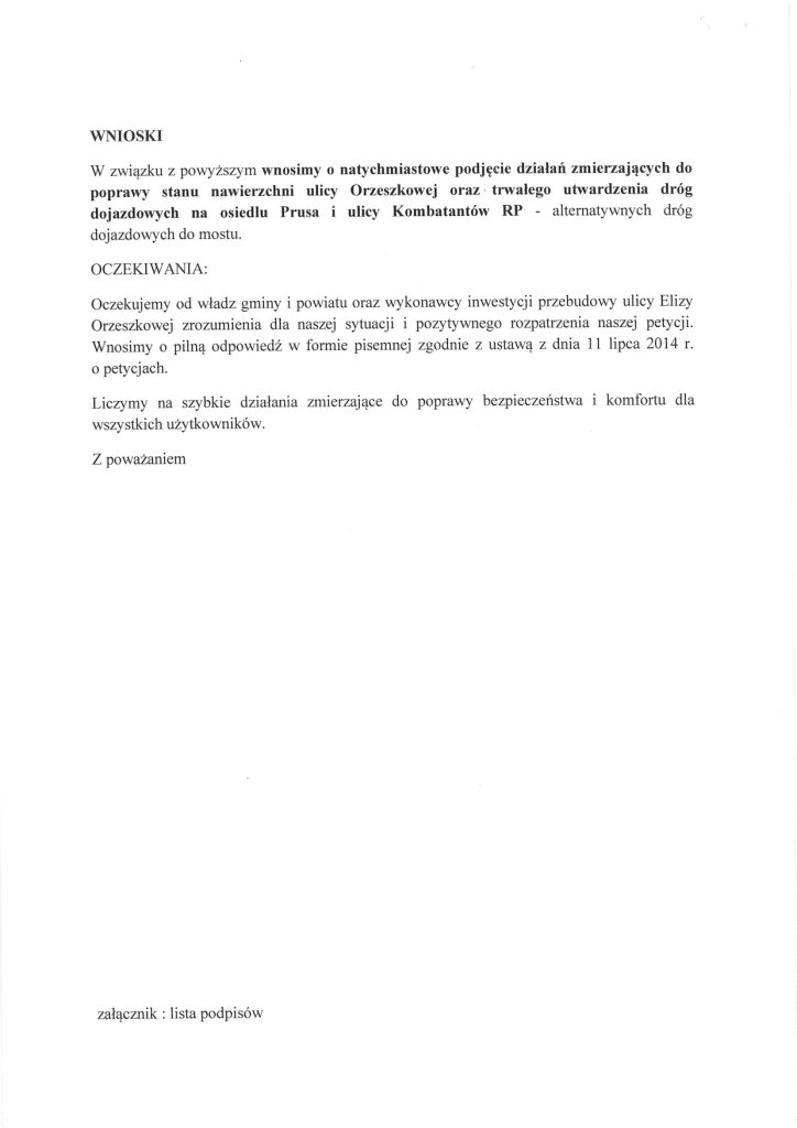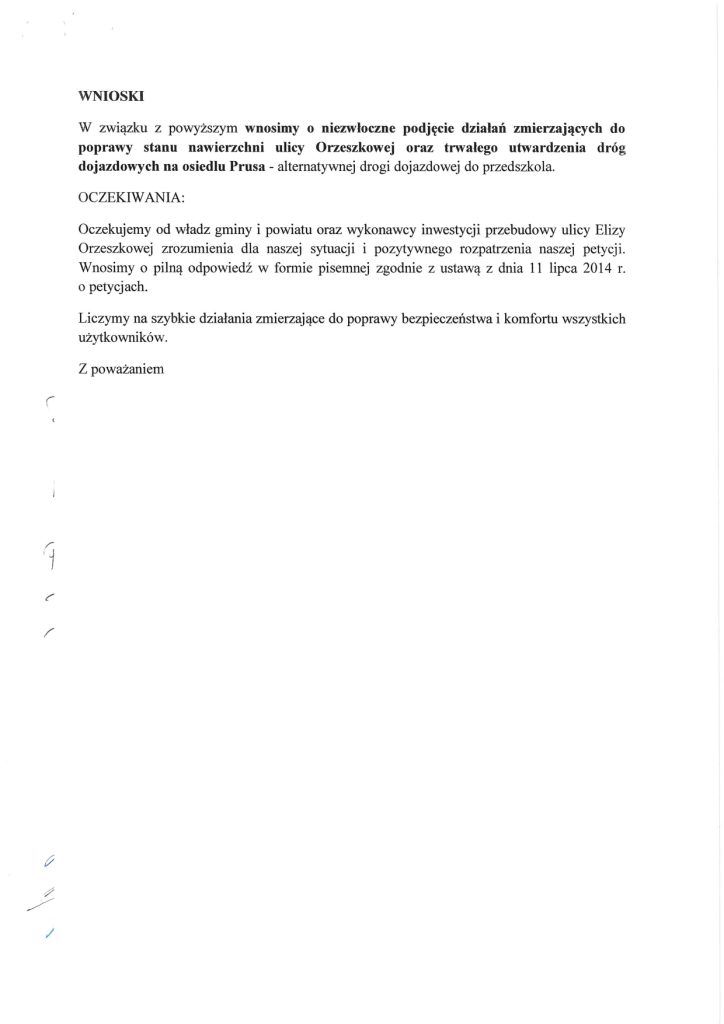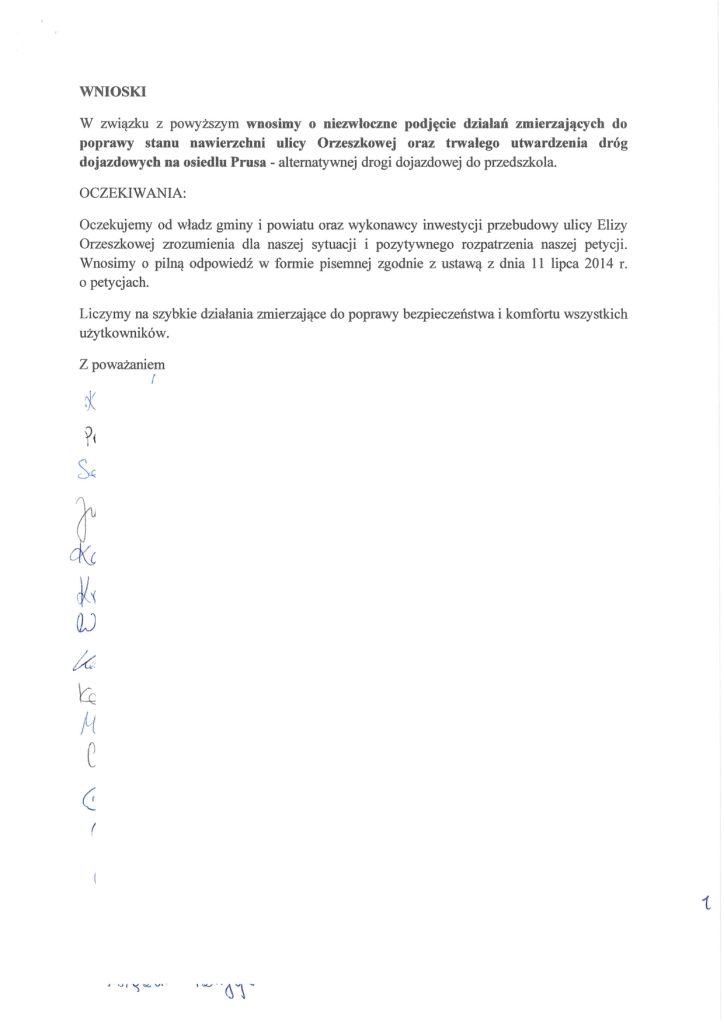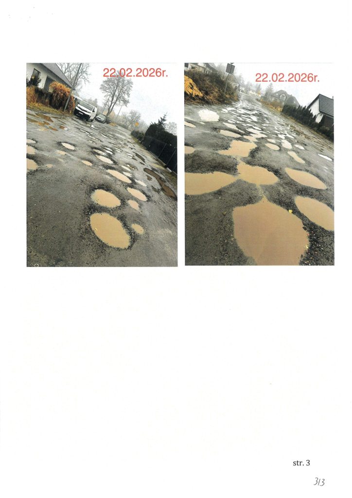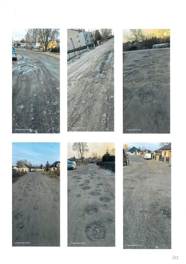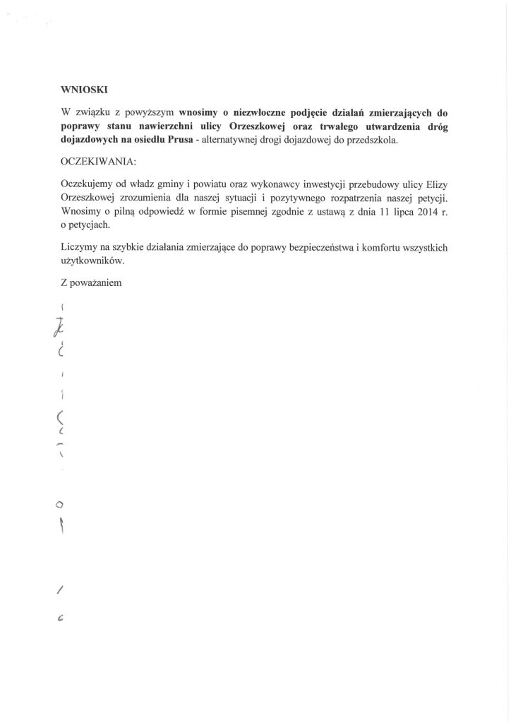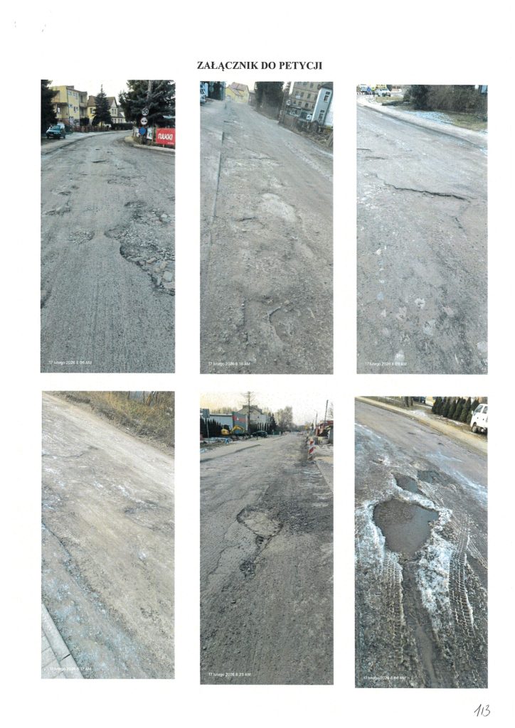 - Petycja nr 1 (Mieszkańcy sołectwa Buniewice): Domagają się niezwłocznej poprawy nawierzchni ulicy Orzeszkowej oraz dróg dojazdowych, w tym osiedla Prusa i ul. Kombatantów RP. Wskazują, że drogi są pełne głębokich dziur i kolein, co uniemożliwia bezpieczny ruch aut i pieszych, a także utrudnia dojazd służbom ratunkowym.