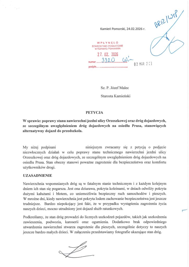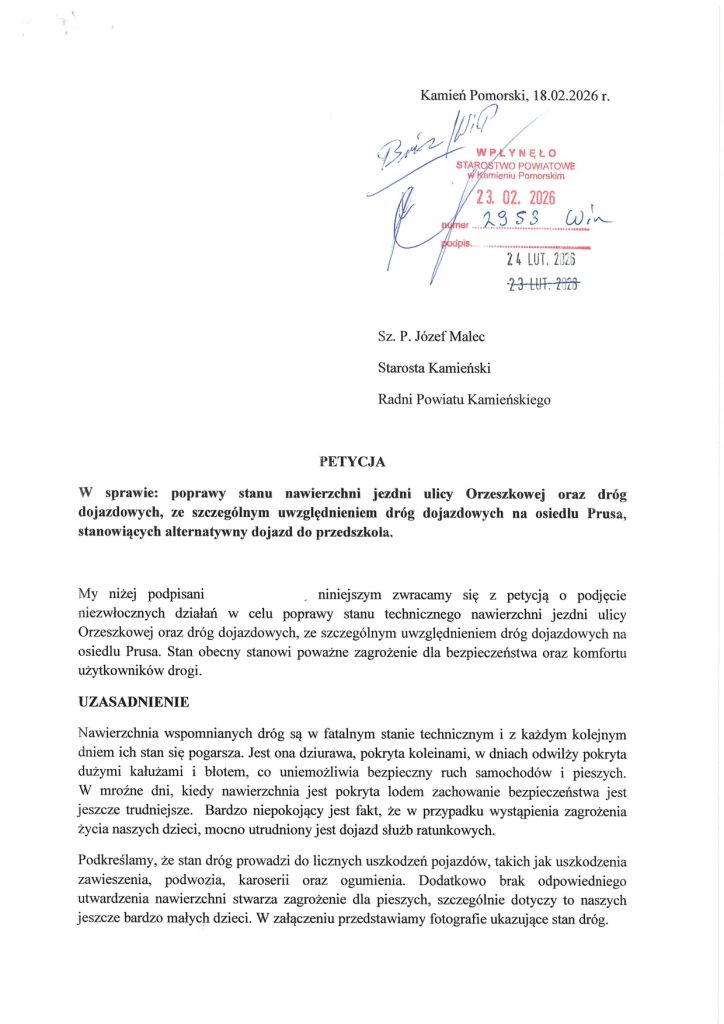 - Petycja nr 4 (Mieszkańcy Kamienia Pomorskiego): Kolejna grupa mieszkańców wnioskuje o to samo: trwałe utwardzenie dróg dojazdowych na osiedlu Prusa oraz naprawę ul. Orzeszkowej, skarżąc się na błoto podczas odwilży i lód w mroźne dni.
