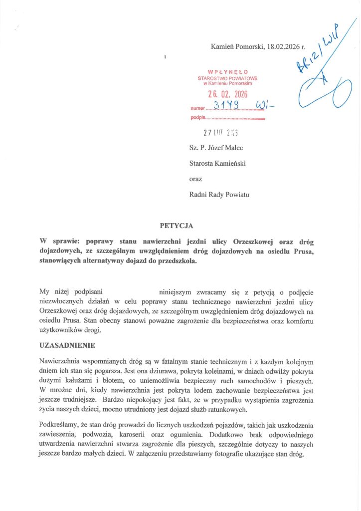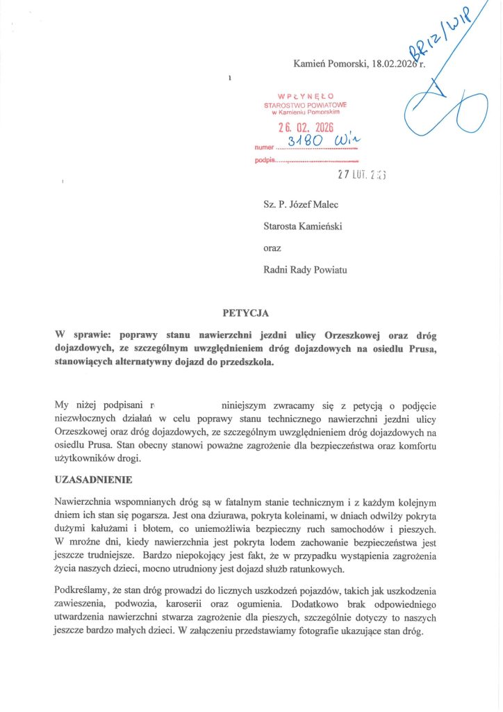 - Petycja nr 2 (Mieszkańcy Kamienia Pomorskiego): Skupia się na poprawie stanu ul. Orzeszkowej i dróg dojazdowych do osiedla Prusa, które stanowią alternatywny dojazd do przedszkola. Podkreślają, że brak utwardzenia nawierzchni zagraża szczególnie małym dzieciom.