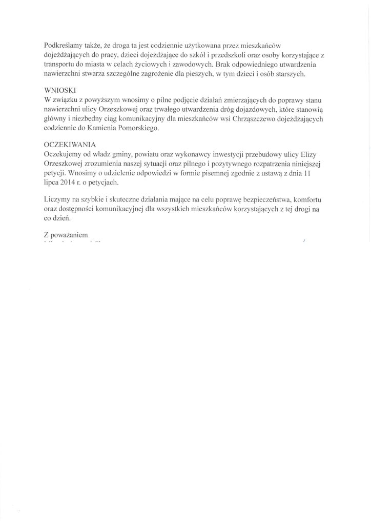 - Petycja nr 6 (Mieszkańcy wsi Chrząszczewo): Wskazują, że ul. Orzeszkowa to dla nich kluczowy ciąg komunikacyjny do pracy, szkół i lekarzy w Kamieniu Pomorskim. Twierdzą, że obecny stan drogi istotnie utrudnia codzienne funkcjonowanie i stwarza ryzyko uszkodzeń elementów podwozia.