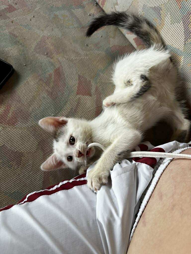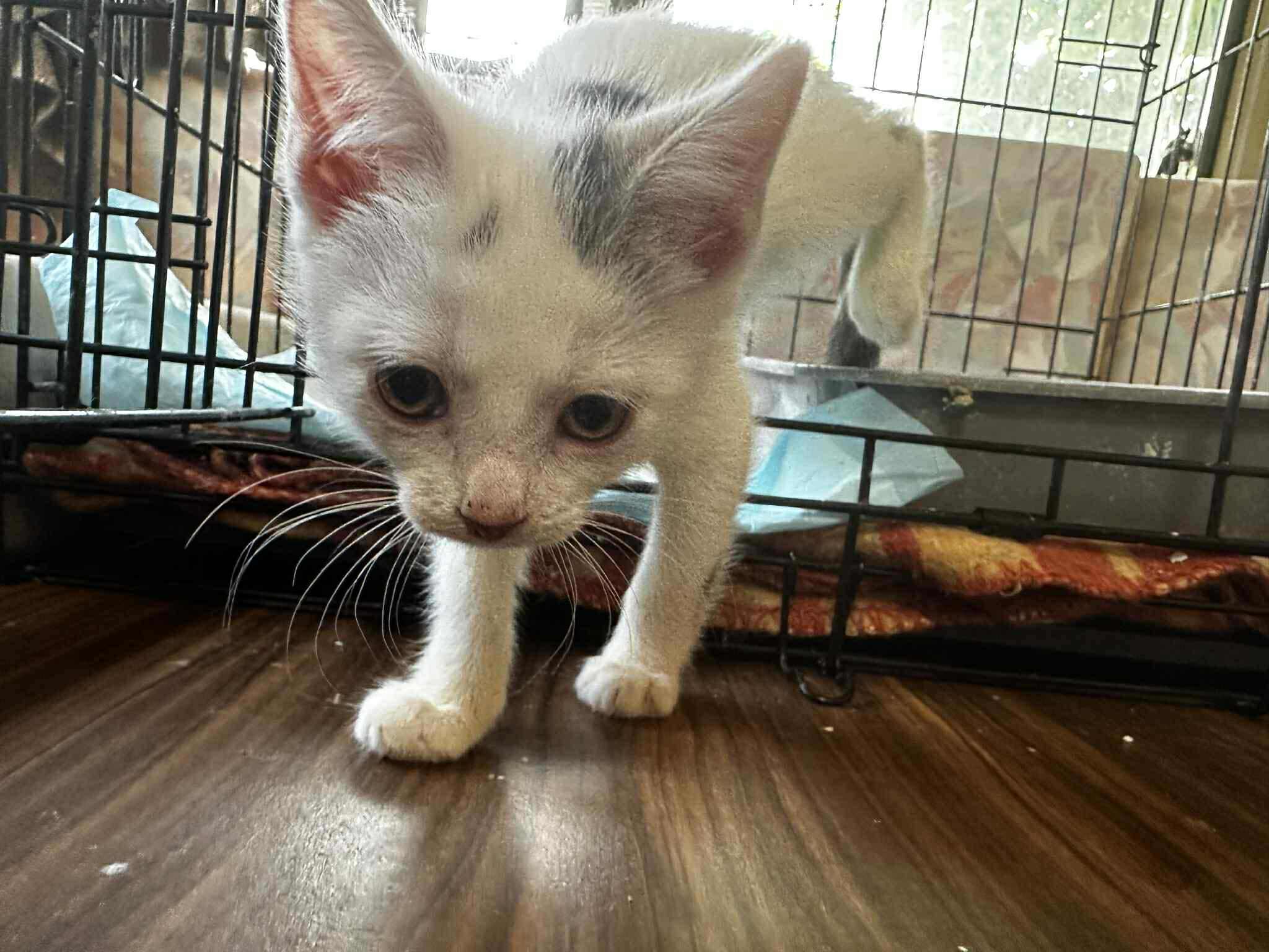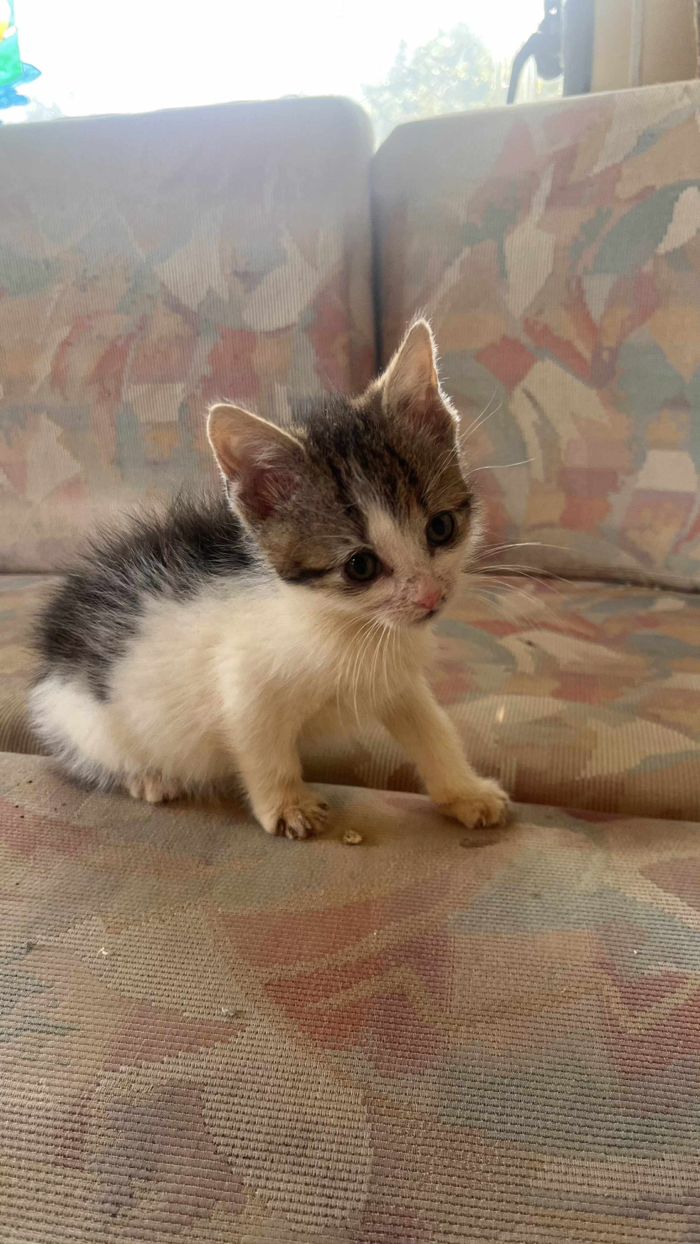 Kocięta zostały zabezpieczone i poddane intensywnemu leczeniu. Ich dzika mama przez kilka tygodni dochodziła do siebie, została również wysterylizowana. Kociaki odchowane na butelce, wyleczone, całkowicie oswojone i przytulaśne. Odrobaczone i gotowe na szczepienia. Znają inne koty i psy — dogadują się z nimi bez problemu.