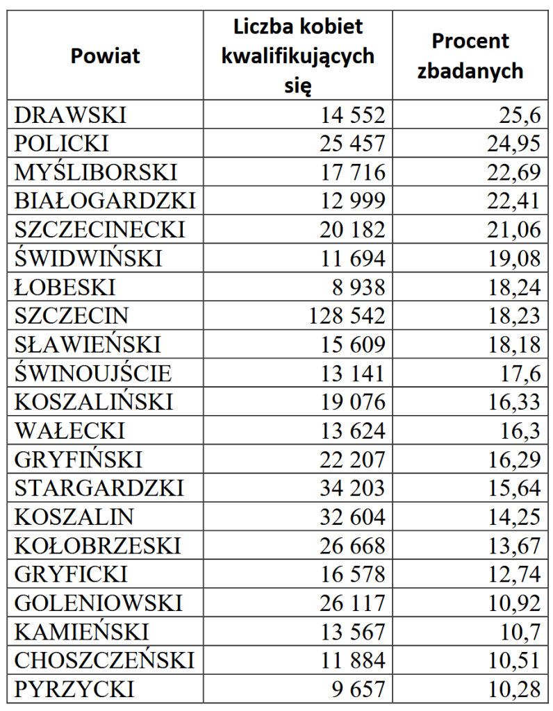 Według stanu na 1 stycznia 2026 roku, w powiecie kamieńskim do profilaktycznej cytologii kwalifikuje się 13 567 kobiet. Niestety, do tej pory z badania skorzystało jedynie 10,7% uprawnionych. Dla porównania, w powiecie drawskim, który zajmuje pierwsze miejsce w regionalnym rankingu, odsetek ten wynosi 25,6%. Gorszy wynik w całym województwie zachodniopomorskim odnotowano jedynie w powiatach choszczeńskim (10,51%) oraz pyrzyckim (10,28%).