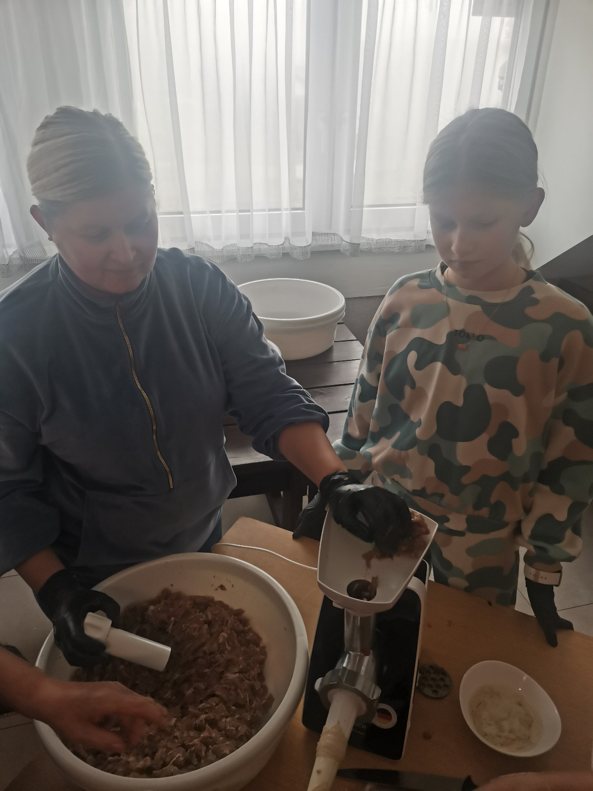 Ten dzień rozpoczęliśmy o godzinie 10.00 na świetlicy wiejskiej w Trzebieszewie, uczestnicy warsztatów zostali podzieleni na grupy i rozpoczęli swoją pracę nad wyrobem najlepszej w okolicy kiełbasy, na którą receptura przekazywana jest z pokolenia na pokolenie. Po zmieleniu mięsa i dodaniu przypraw, każda grupa przystąpiła do wyrabiania mięsa, a następnie do napychania jelit i formowania kiełbasy. Po przygotowaniu wyrobów i zawieszeniu na odpowiednich hakach udaliśmy się do wędzarni gdzie rozpoczęliśmy kilkugodzinny proces wędzenia. Sposoby wędzenia są różne, my korzystamy z wędzarni opalanej drewnem, w której palenisko znajduje się bezpośrednio pod wędzonym mięsem, ważne jest aby ogień miał odpowiednią wysokość. Część przygotowanej kiełbasy, która nie zmieściła nam się na haki a tym samym do wędzarni, została usmażona i zjedzona z ogromnym apetytem 😉 Mówiąc krótko było smacznie i twórczo. Zobaczcie sami na zdjęciach jakie smakołyki przygotowaliśmy podczas warsztatów.