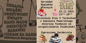 W niedzielę, 16 listopada, podczas Pchlego Targu w hali sportowej przy ul. Wolińskiej 9 w Kamieniu Pomorskim pojawi się stoisko przygotowane przez uczniów klas V Technikum Zespołu Szkół Ponadpodstawowych im. Stanisława Staszica. Młodzież, wspierana przez rodziców, będzie sprzedawać własnoręcznie przygotowane wypieki, aby zebrać środki na organizację studniówki (nieoficjalnie wiemy, że będą przepyszne!).