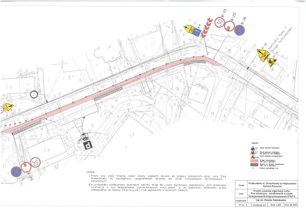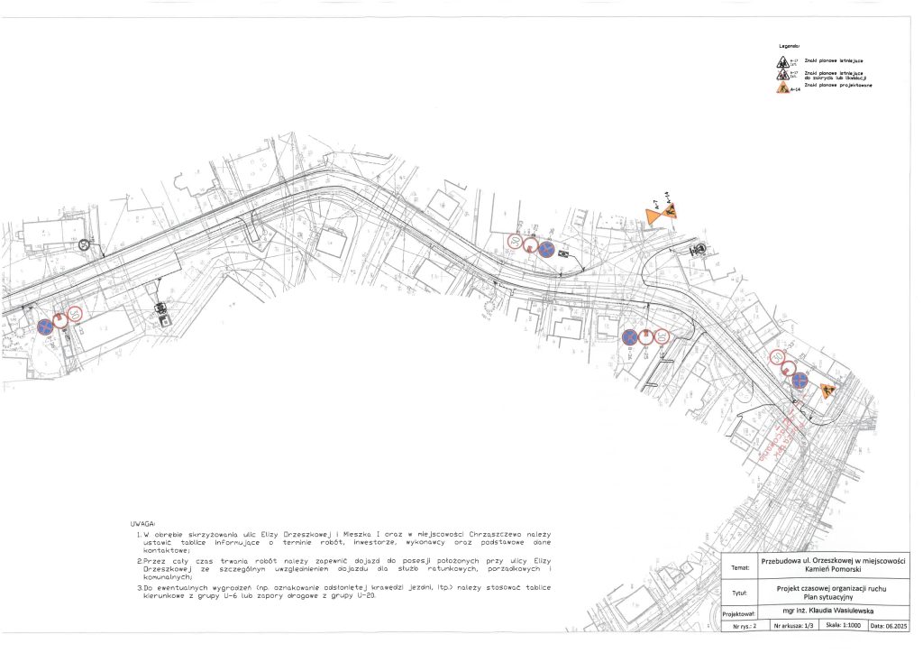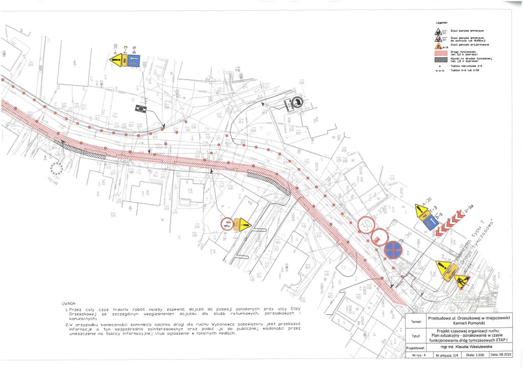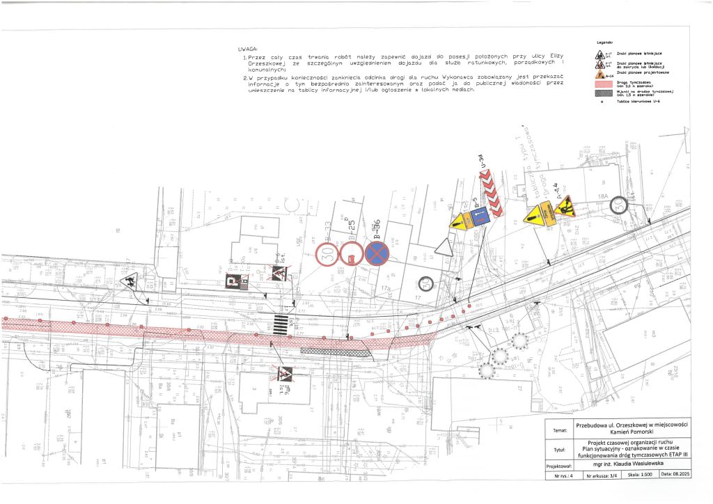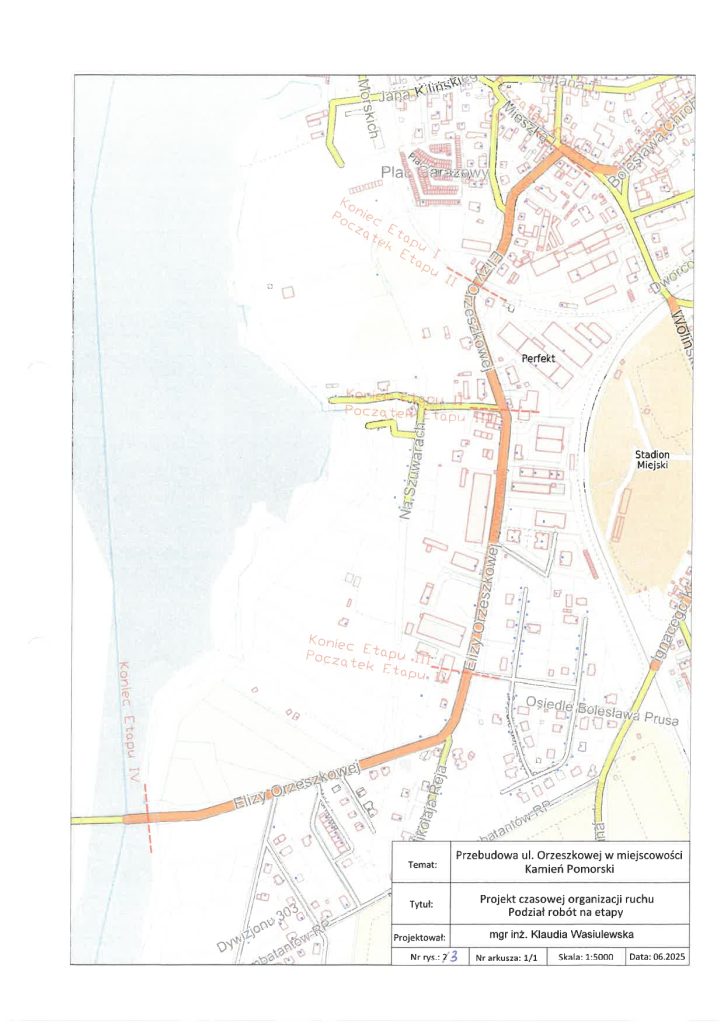 Po podjęciu wątpliwości, przez służby Powiatu Kamieńskiego monitorujące na bieżąco przebudowę drogi ul. Orzeszkowej, w sprawie zgodności czasowej organizacji ruchu z zatwierdzonym projektem, w dniu 03.03.2026 r. służby Starosty Kamieńskiego przeprowadziły kontrolę prawidłowości zastosowania, wykonania i funkcjonowania znaków drogowych oraz urządzeń bezpieczeństwa ruchu drogowego, umieszczonych na przebudowywanej drodze, w ramach zatwierdzonej czasowej organizacji ruchu. Podczas kontroli stwierdzono, iż czasowa organizacja ruchu jest niezgodna ze stanem faktycznym, wynikającym z zastosowanego na budowie oznakowania. W związku z powyższym wezwano Wykonawcę, pismem Kom.7121.117.2025.AP, z dnia 04.03.2026 r., do niezwłocznego opracowania i przedłożenia do zatwierdzenia nowego projektu czasowej organizacji ruchu, która uwzględni stan i zakres faktycznie wykonywanych robót oraz bezpieczeństwo ruchu drogowego pieszych i pojazdów. Obecnie oczekujemy na przedłożenie przez Wykonawcę nowego projektu TOR.