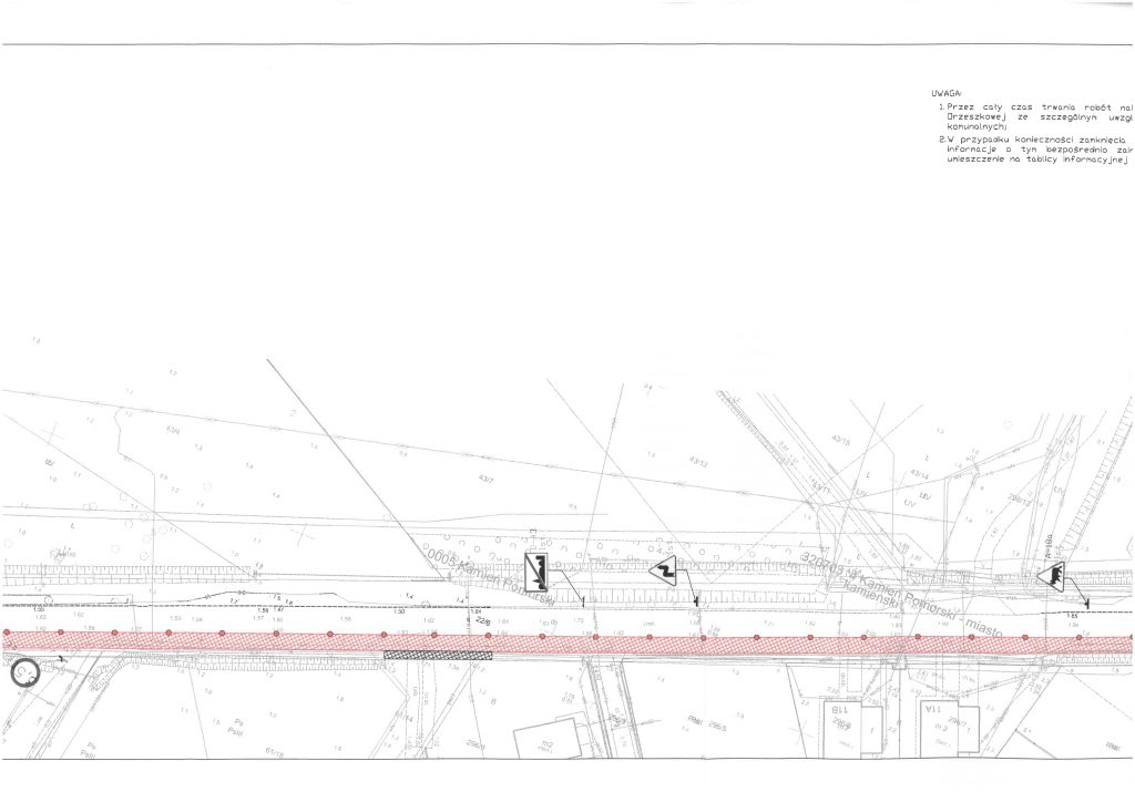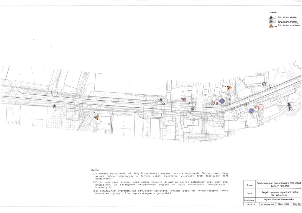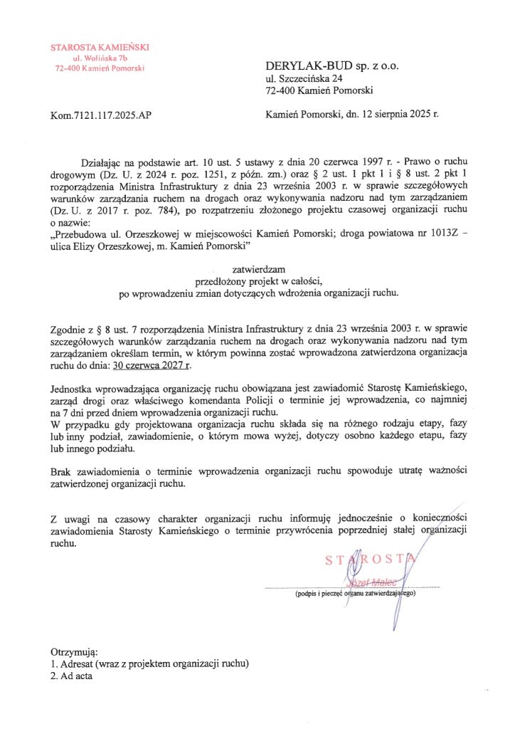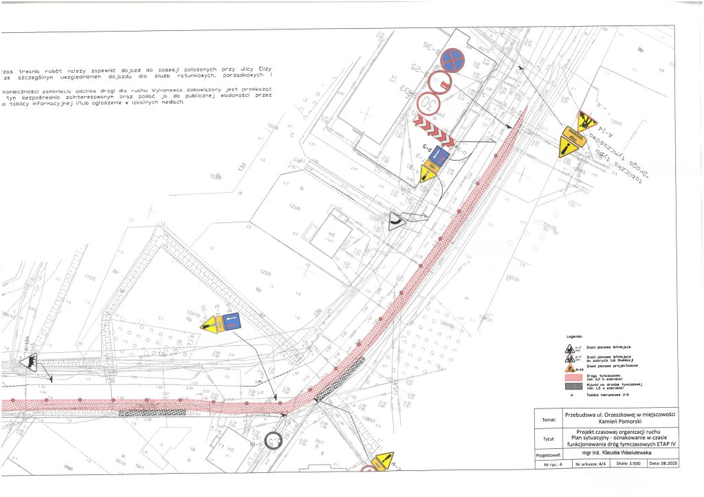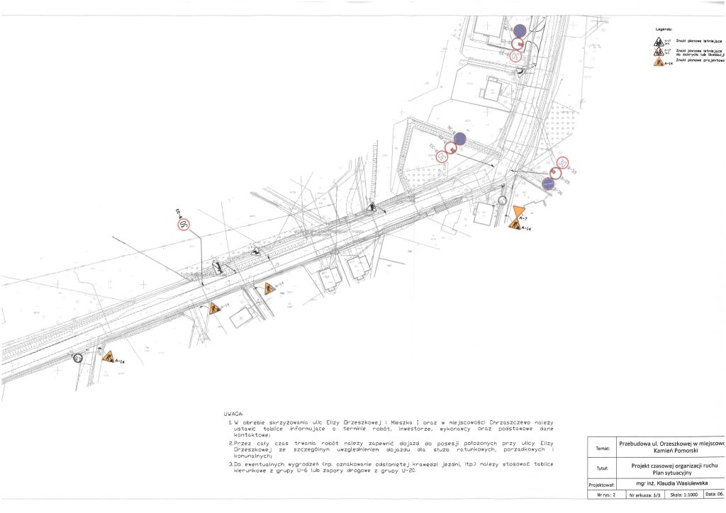 Po podjęciu wątpliwości, przez służby Powiatu Kamieńskiego monitorujące na bieżąco przebudowę drogi ul. Orzeszkowej, w sprawie zgodności czasowej organizacji ruchu z zatwierdzonym projektem, w dniu 03.03.2026 r. służby Starosty Kamieńskiego przeprowadziły kontrolę prawidłowości zastosowania, wykonania i funkcjonowania znaków drogowych oraz urządzeń bezpieczeństwa ruchu drogowego, umieszczonych na przebudowywanej drodze, w ramach zatwierdzonej czasowej organizacji ruchu. Podczas kontroli stwierdzono, iż czasowa organizacja ruchu jest niezgodna ze stanem faktycznym, wynikającym z zastosowanego na budowie oznakowania. W związku z powyższym wezwano Wykonawcę, pismem Kom.7121.117.2025.AP, z dnia 04.03.2026 r., do niezwłocznego opracowania i przedłożenia do zatwierdzenia nowego projektu czasowej organizacji ruchu, która uwzględni stan i zakres faktycznie wykonywanych robót oraz bezpieczeństwo ruchu drogowego pieszych i pojazdów. Obecnie oczekujemy na przedłożenie przez Wykonawcę nowego projektu TOR.