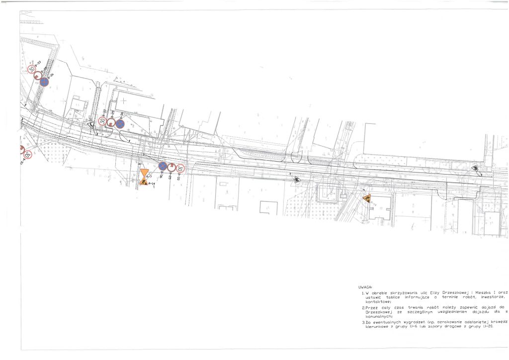 • Czy obowiązująca na ul. Elizy Orzeszkowej tymczasowa organizacja ruchu jest zgodna z zatwierdzonym projektem? Proszę o udostępnienie projektu TOR oraz informacji, kiedy ostatnio przeprowadzono kontrolę jej zgodności z rzeczywistym stanem oznakowania i zabezpieczenia terenu budowy.