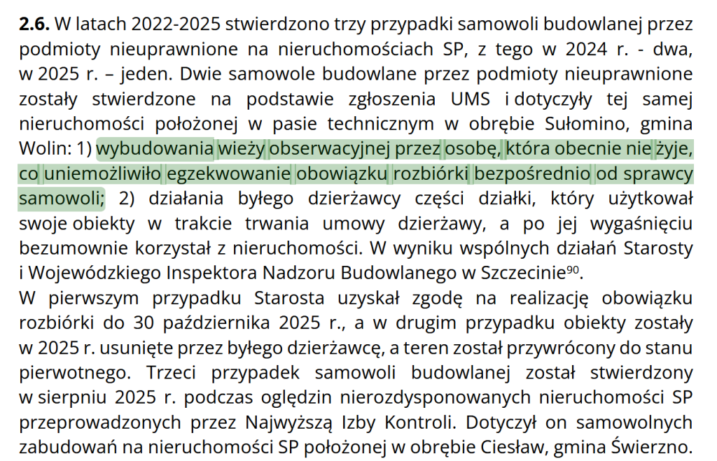 Listę otwieramy sytuacją, którą NIK zastała w Sułominie (gmina Wolin). Na tamtejszej działce Skarbu Państwa stanęła… wieża obserwacyjna. Kto ją zbudował? Osoba, która już nie żyje, co zdaniem urzędników „uniemożliwiło egzekwowanie obowiązku rozbiórki”. W tej samej miejscowości były dzierżawca po wygaśnięciu umowy nadal korzystał z terenu jak ze swojego, stawiając kolejne obiekty.