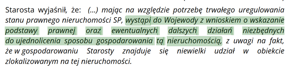Starosta przyznał, że sytuacja jest „problemowa” i zapowiedział, że zapyta Wojewodę o podstawę prawną, jak w ogóle zarządzać budynkiem, którego ma tylko kawałek. Przez lata najwyraźniej nikomu to nie przeszkadzało