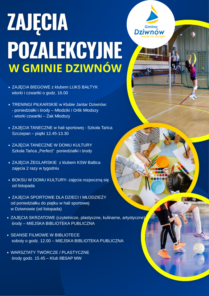 Gmina Dziwnów zaprasza dzieci i młodzież do udziału w bogatej ofercie zajęć pozalekcyjnych. Wśród propozycji znalazły się m.in. zajęcia biegowe z klubem LUKS Bałtyk, treningi piłkarskie w klubie Jantar Dziwnów oraz zajęcia żeglarskie prowadzone przez KSW Baltic.