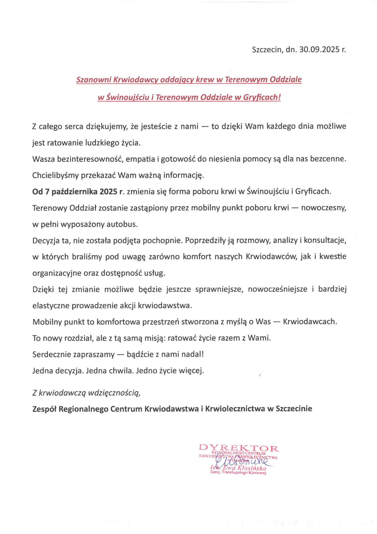 Regionalne Centrum Krwiodawstwa i Krwiolecznictwa w Szczecinie poinformowało, że od 7 października 2025 r. zamknięte zostaną Terenowe Oddziały Krwiodawstwa w Świnoujściu i Gryficach. Zostaną one zastąpione przez mobilne punkty poboru krwi.