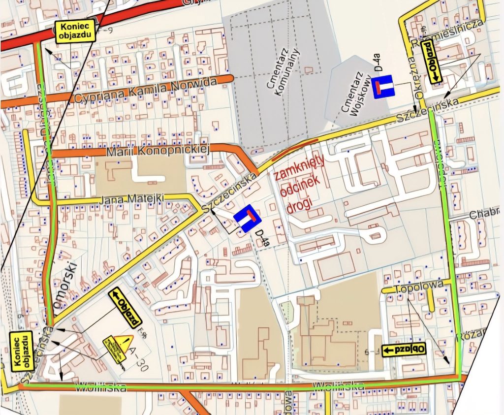 - zamknięty zostanie odcinek ul. Szczecińskiej od skrzyżowania z ul. Marii Konopnickiej do pierwszego wjazdu na Lidl,