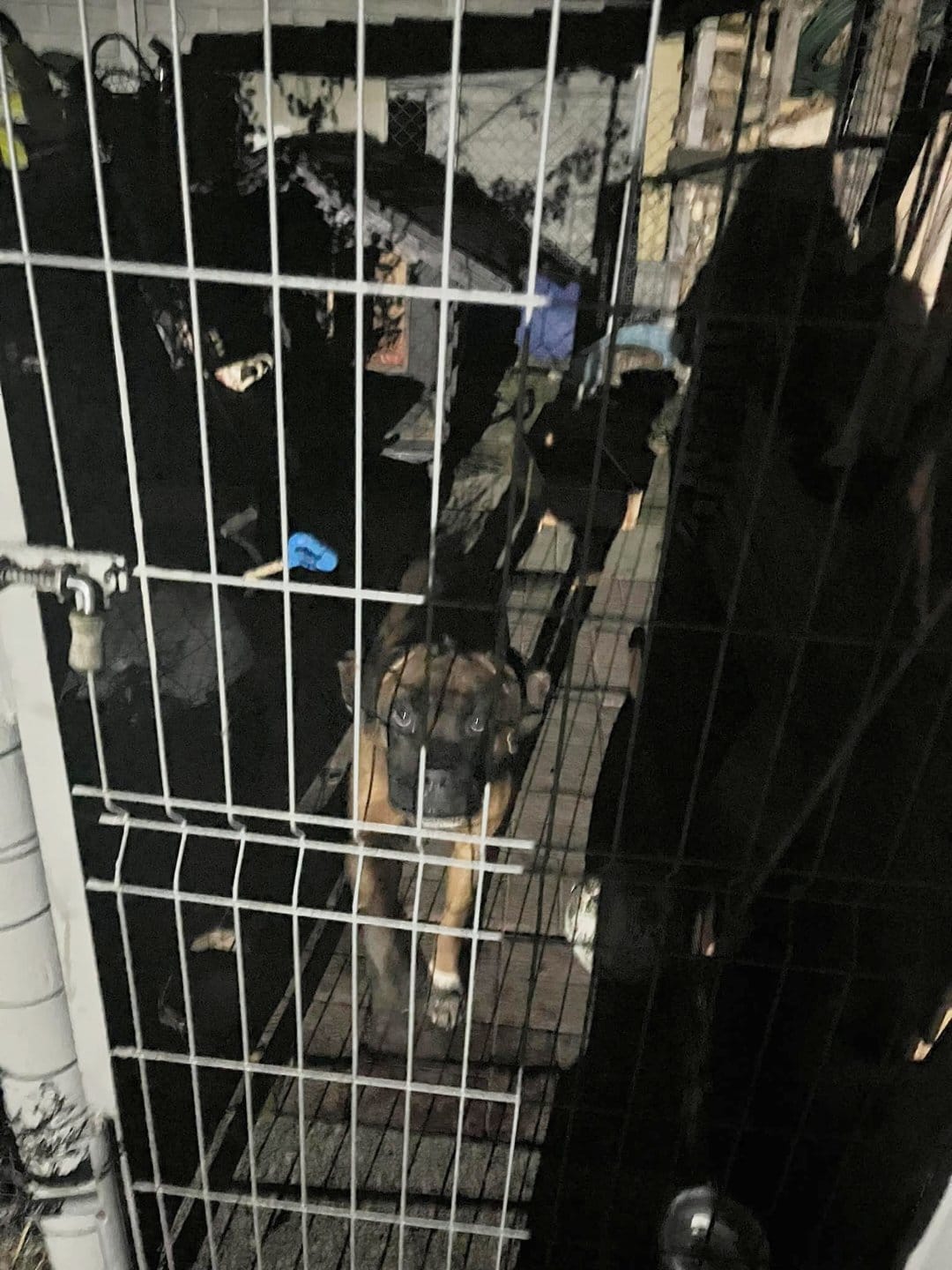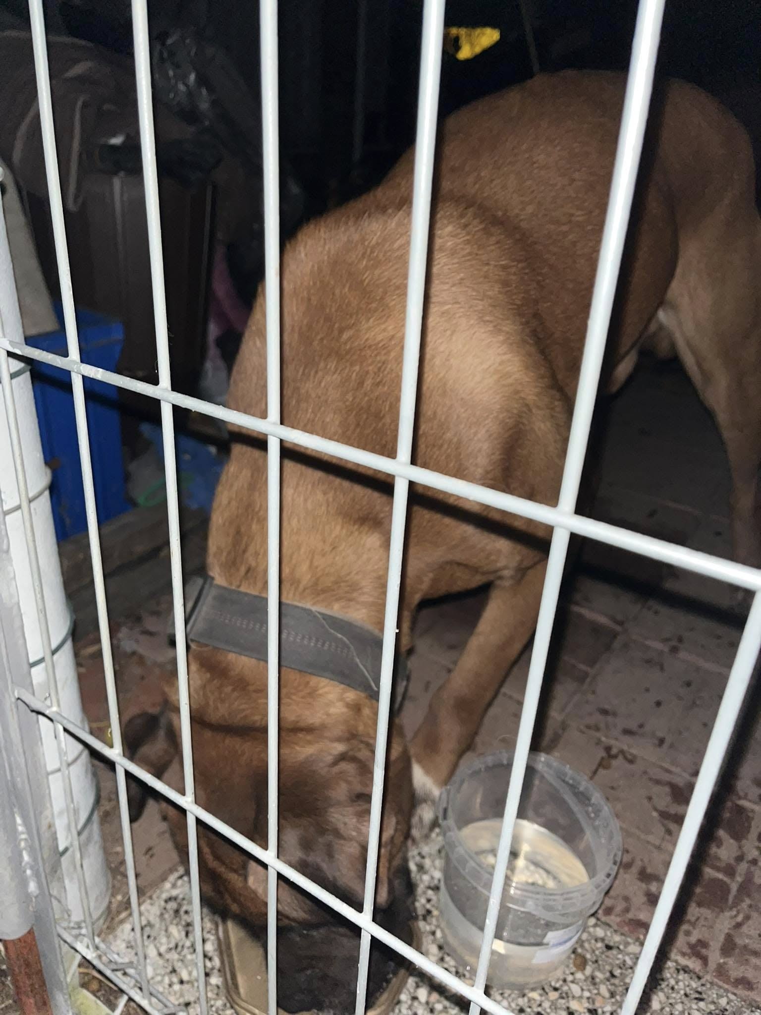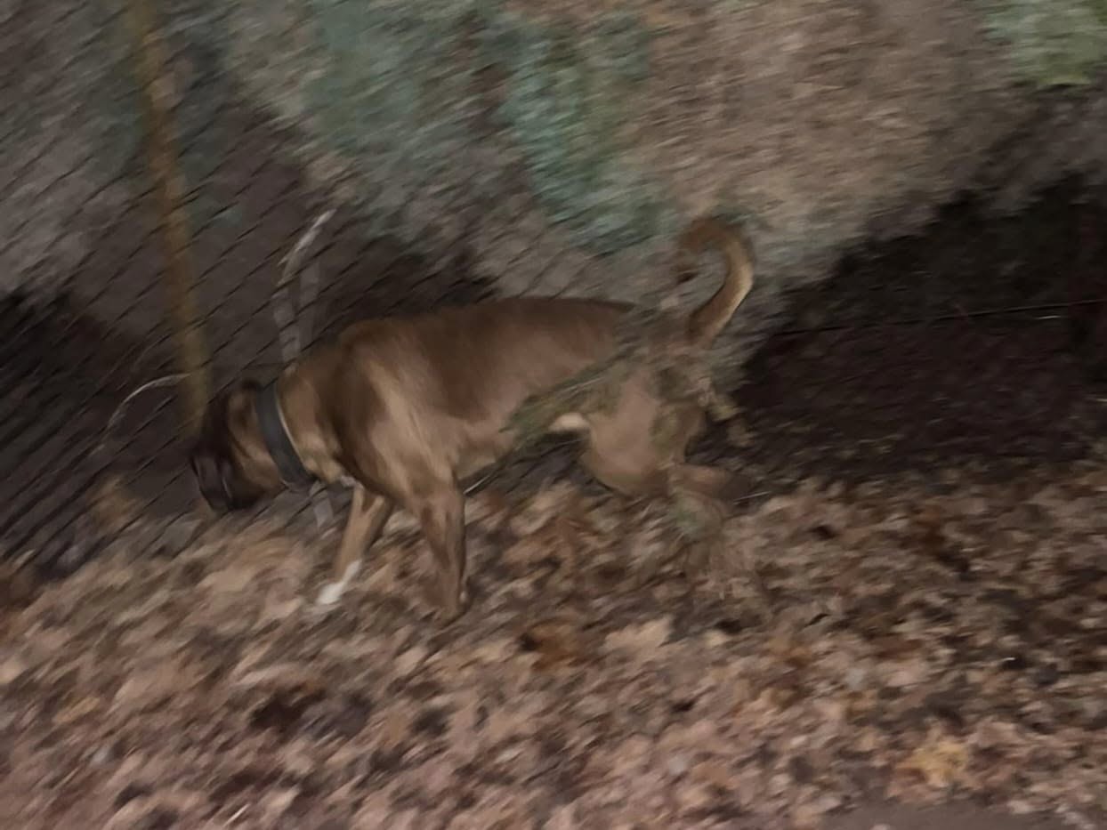 - Samiec — bokser maści brązowej z białymi plamami na klatce piersiowej oraz białymi skarpetkami na przednich łapach. W obroży.